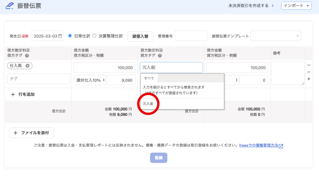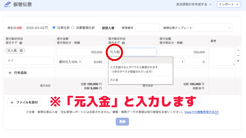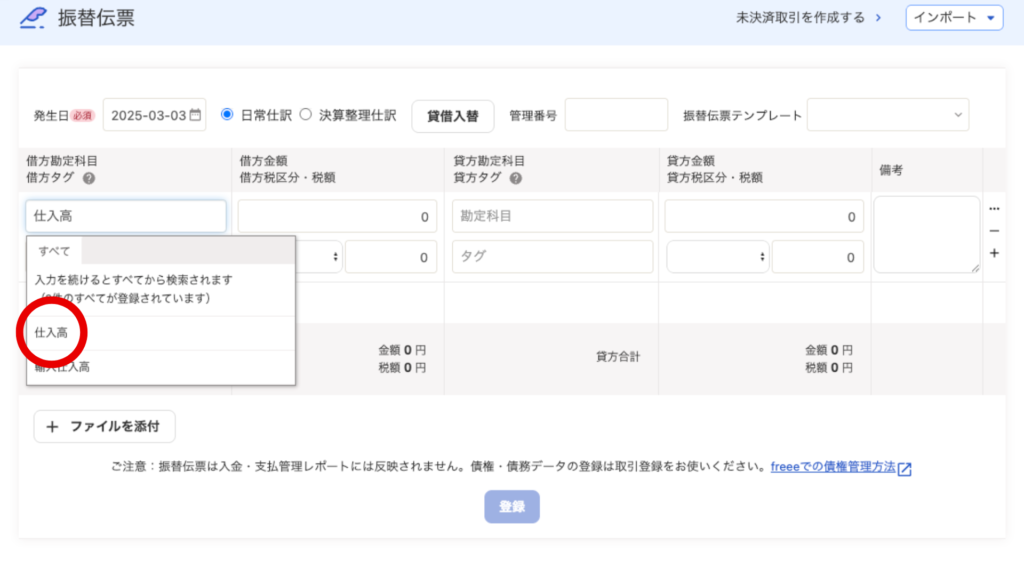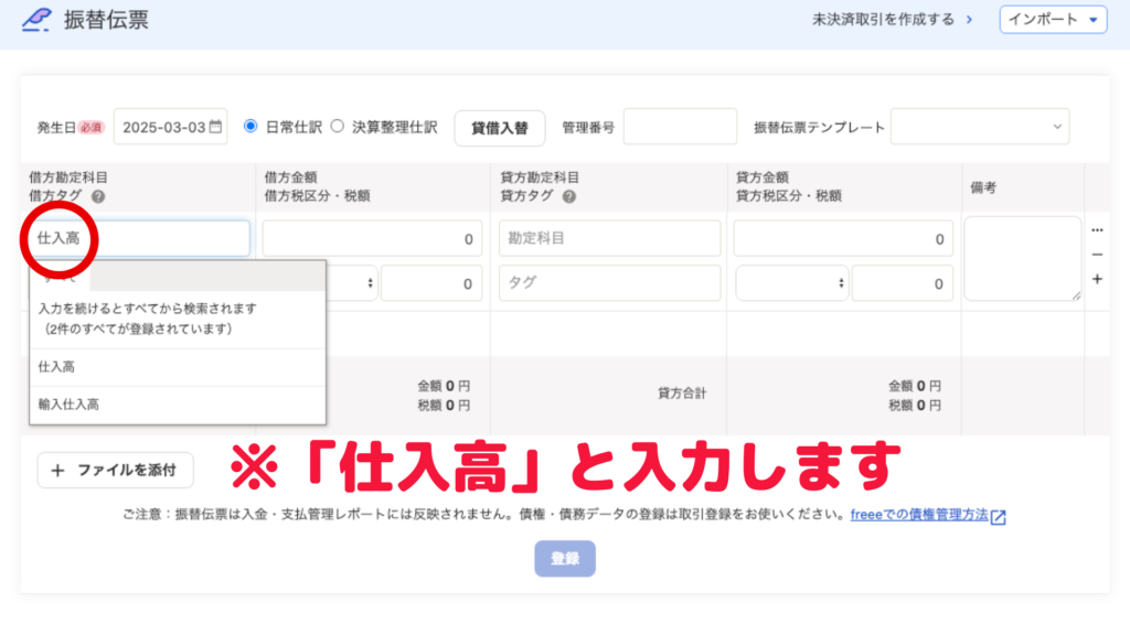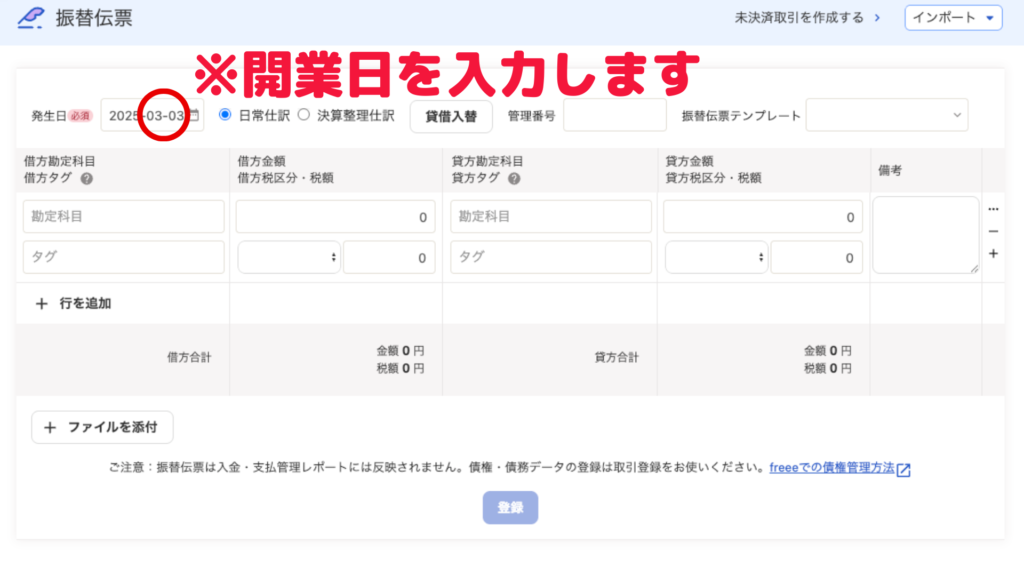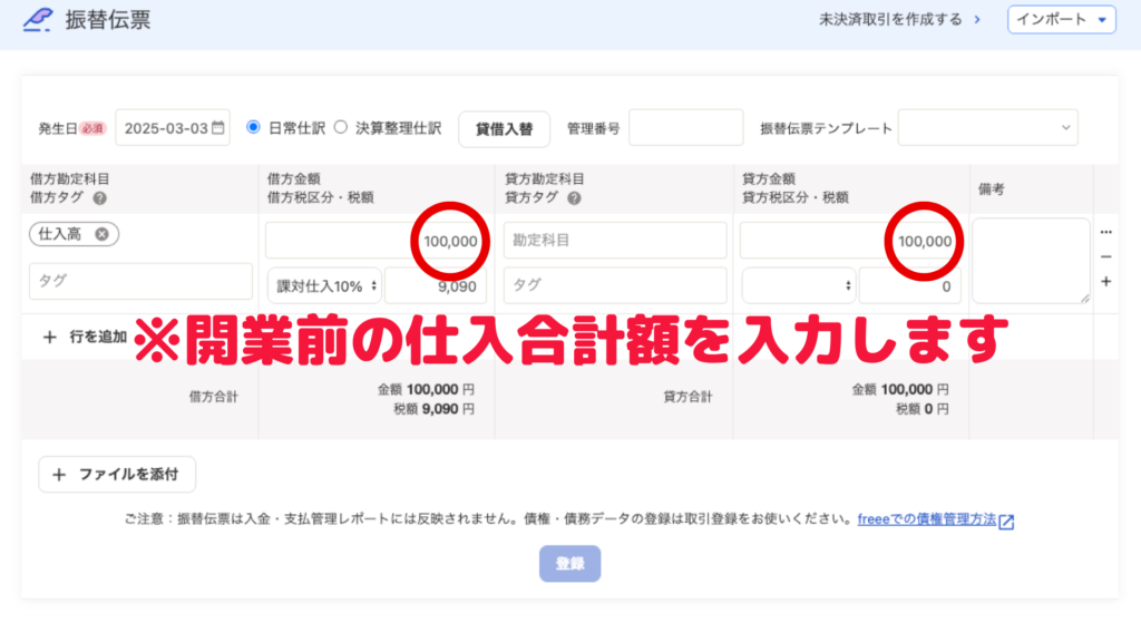 開業前の仕入れは、開業日の日付で開業前までにかかった仕入合計額をfreeeの振替伝票というのを使って登録します!