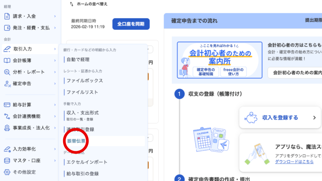 1.ホーム画面から「取引入力」の中の「振替伝票」をクリック